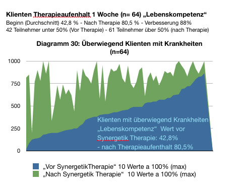 Qualitätssicherung Die Qualität einer Methode kann man messen. In den Jahren 2005-06 (Synergetik Therapie 7.0) haben wir eine Fragebogenaktion durchgeführt und subjektiv jeweils 10 Werte zur Lebenskompetenz erfasst. Es gab verschiedene Gruppen mit einer Gesamtzahl von n= 292 Teilnehmer. 128 Teilnehmer der Ausbildung zur Synergetik bewerteten ihre Veränderung der Lebenskompetenz - aufgeteilt in 10 Bereiche - durch die absolvierte Grundausbildung von 4 Wochen, verteilt über ein halbes Jahr. Sie verbesserten sich von 53% auf 78 % - also um 46%. Den höchsten Profit erlebten Klienten mit Krankheiten - n=64. Hier verbesserte sich die abgefragte Lebenskompetenz von 42,8% vor der Therapiewoche auf 80,5% nach dem Therapieaufenthalt. Dies bedeutet eine relative Verbesserung um 88%. Die Methode hat in den letzten 15 Jahren eine wesentlich verbesserte und nachhaltig wirkende Version erhalten: Synergetik Therapie 13.0 entspricht = Psychobionik 3.0 Echte Heilung ist immer einhergehend mit einer Steigerung der Lebenskompetenz. Menschen mit schweren Krankheiten tragen immer viele und schwierige unverarbeitende Erlebnisse des Lebens in sich, wobei die PSYCHE bis ins Ahnenfeld reicht. Wir arbeiten rückwärts bis in die 4. Generation, da die PSYCHE fraktal aufgebaut ist. Weitere Diagramme und zum Fragebogen - klicken |